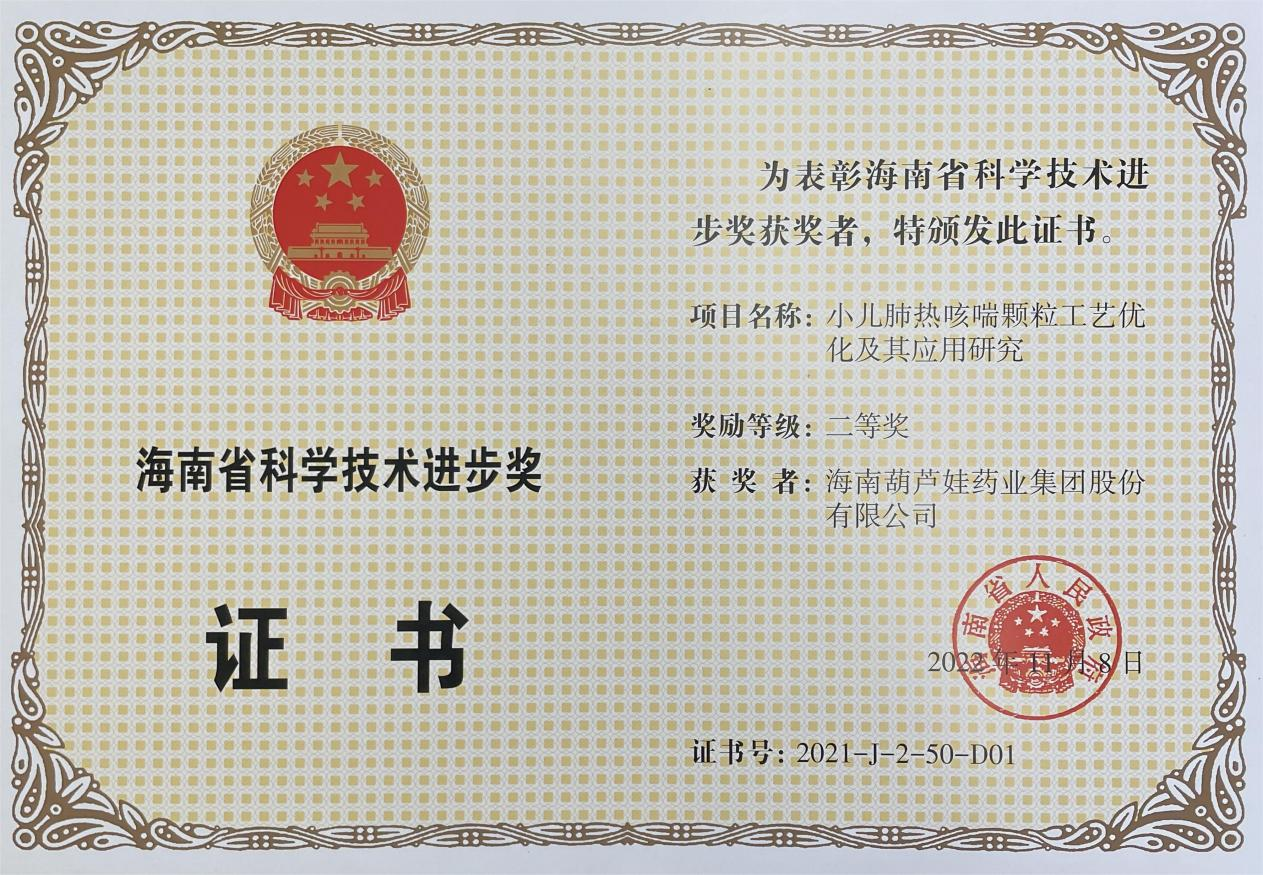 为此,小儿肺热咳喘颗粒的制备方法获得了第二十一届中国专利优秀奖(2019年),专利申请号:ZL201010134951,此次作为专利技术的应用,获得了2021年度海南省科学技术进步奖二等奖。在此之前,yp电子牌小儿肺热咳喘颗粒还多次被授予“临床价值中成药品牌”、“中国连锁药店最具合作价值单品”,荣登“中国医药品牌榜”。